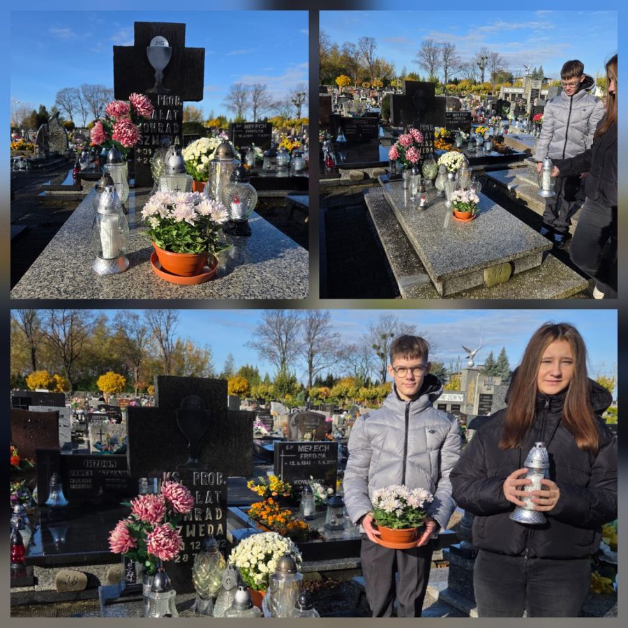 W związku ze zbliżającą się Uroczystością Wszystkich Świętych  przedstawiciele Samorządu Uczniowskiego udali się na cmentarz, aby złożyć znicze i kwiaty na grobie Patrona Szkoły- Księdza Prałata Konrada Szwedy.