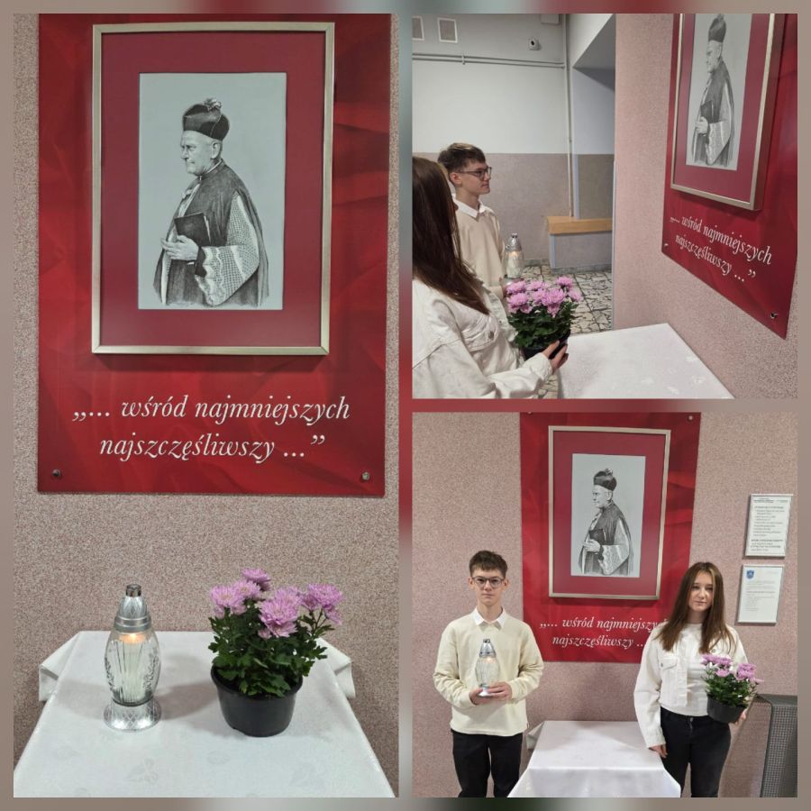 Symboliczny gest pamięci odbył się również w murach naszej szkoły — pod obrazem Patrona, gdzie zapłonęło światełko wdzięczności i refleksji. Tym samym uczniowie oddali hołd Osobie, która stanowi dla społeczności szkolnej wzór postawy, odwagi i zaangażowania, a także przypomnieli o znaczeniu pamięci historycznej i duchowej.