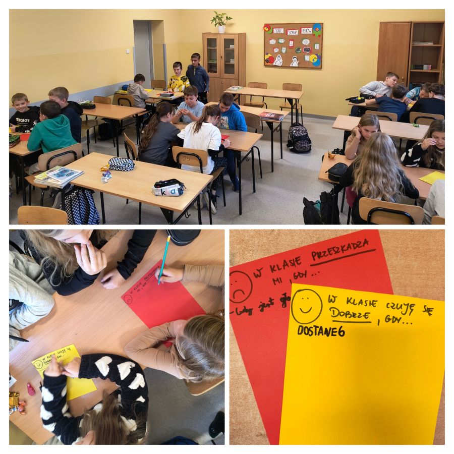 Na lekcjach wychowawczych uczniowie wspólnie tworzyli swój Kodeks Klasowy. Najpierw zastanawiali się, co sprawia, że w klasie czują się dobrze, a co przeszkadza w miłej atmosferze.